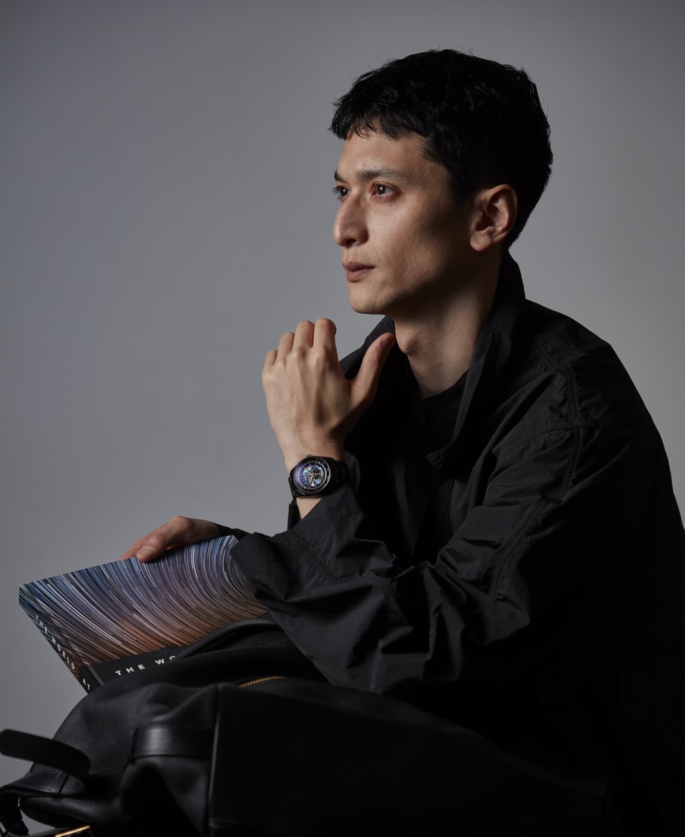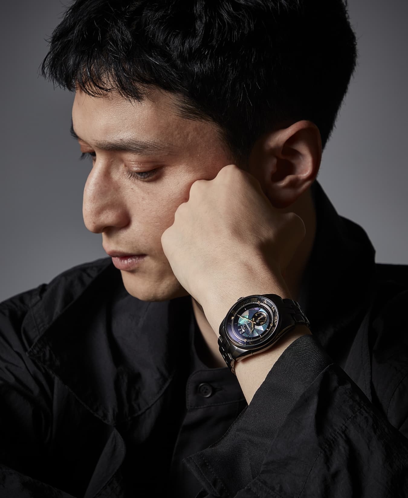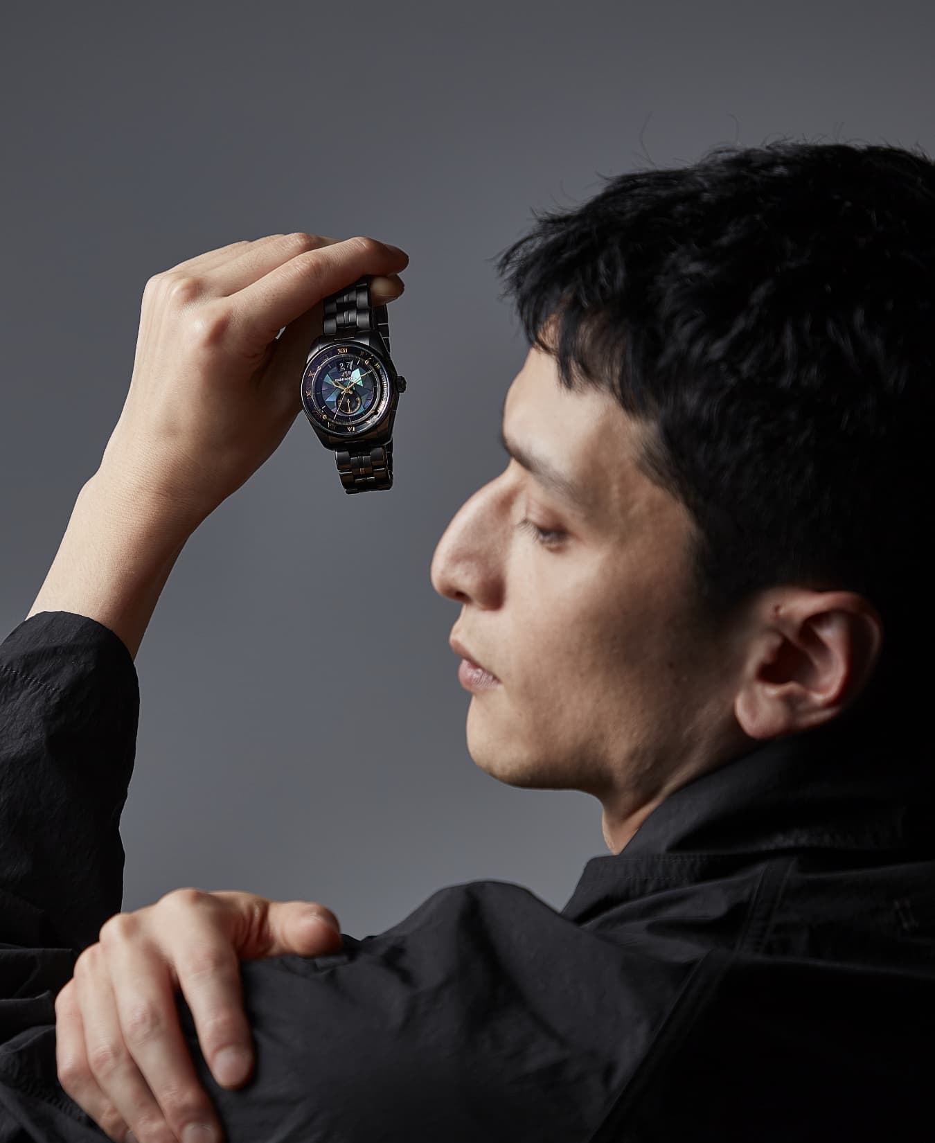 その宇宙観を最も繊細に体現しているのが、メカニカルモデルだ。会津漆の伝統工芸士・儀同哲夫が手掛けた螺鈿細工の文字板を備える一本で、貝殻の破片を一つひとつ手作業で散りばめた文字板は、見る角度によって無数の表情を映し出す。同じものはふたつとして存在しない。艶やかなブラックのケースとバンドに、ゴールドのインデックスと針が描く情景は、まさに“日常に降りた宇宙”。ケース径42㎜、厚さ14㎜という控えめなサイズが袖口に心地よく収まり、静かだが確かな存在感を放っている。