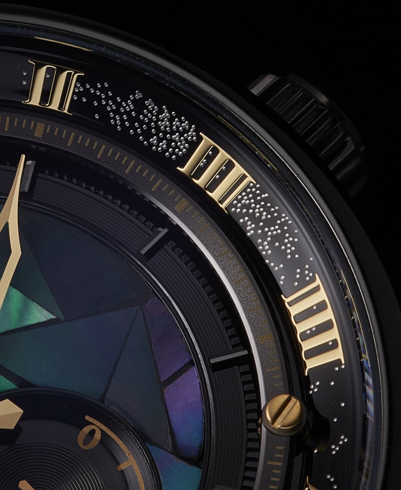文字板に施された螺鈿細工は、光の当たり方で青、緑、紫へと色が揺らぎ、幾層もの表情を生み出す。儀同による「暈響(かさねきょう)」の技法——漆地に貝片をていねいに磨き重ねていく過程から生まれる光の層が、その奥行きを支えている。同氏は瑞宝単光章を受章した匠であり、その技の確かさは言うまでもない。見返しリングに施されたプラチナ粉の蒔絵表現は、星々の軌跡を想起させる意匠だ。手首を傾けるたびに表情を変える螺鈿の光は、デュラテクトDLCによる艶やかな黒と呼応し、より鮮やかに浮かび上がる。