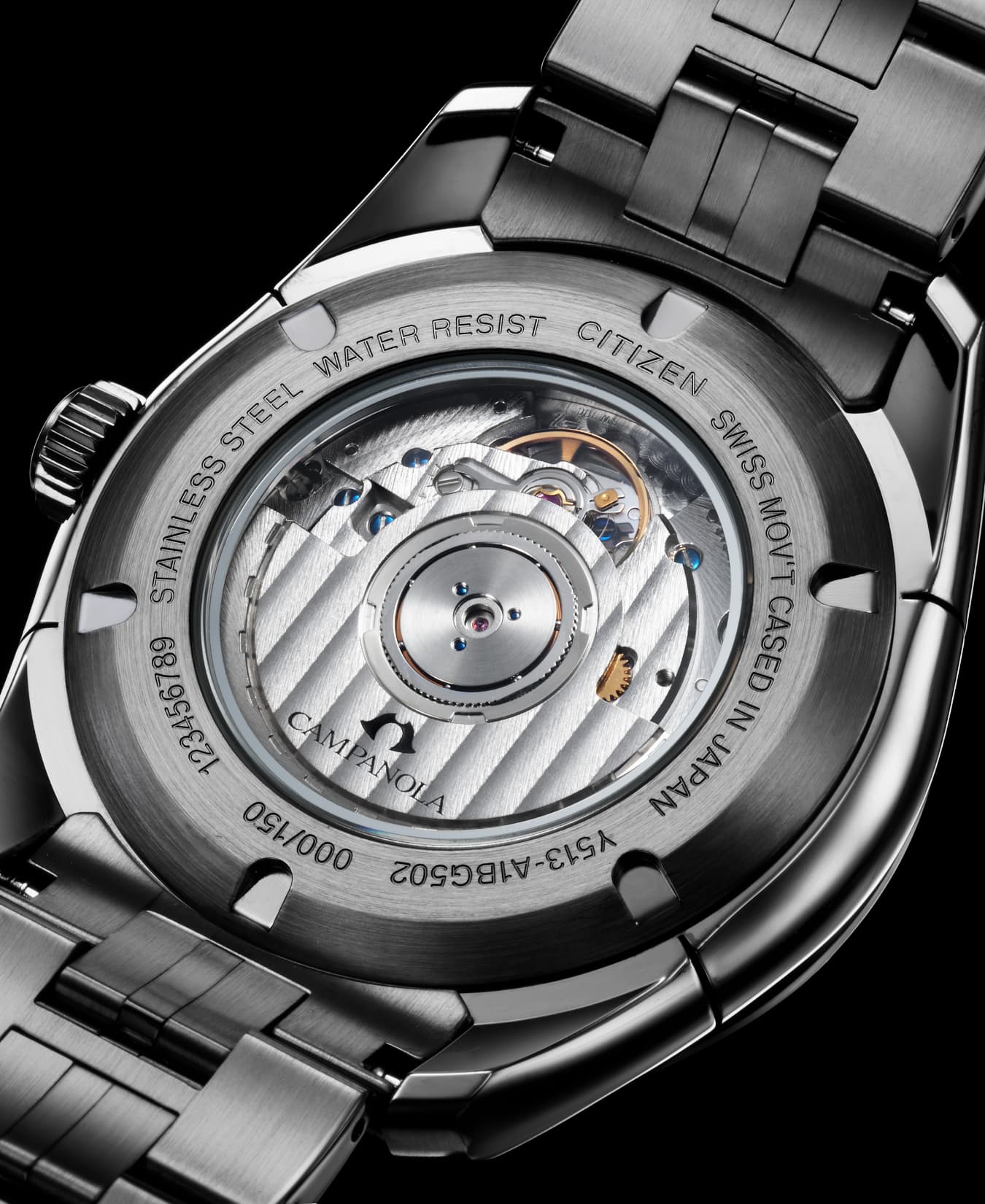 「Cal.Y513」は毎秒8振動=毎時28,800振動という高精度のリズムで約42時間の持続時間を支える。その残量は前面のパワーリザーブ表示でひと目にわかる。また、文字板上部に設けられたビッグデイト表示には、「今日という一日を大切に」というカンパノラの時間哲学が息づく。秒針停止機能や日付早修正機能など、使い手を支える機能も揃い、日常の相棒として不足はない。ケース外装にはデュラテクトDLCが施され、ビッカース硬度1,000〜1,400HVという高い耐傷性を誇る。美しい艶を保ちながら、小傷へも強さを見せる仕上がりだ。内側の精緻な鼓動と外側の強靭さが響き合い、ひとつの“時を宿す器”として静かに完結していく。